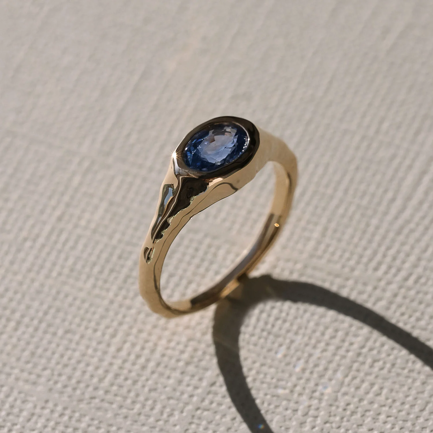 This molten ring features a natural 7x5mm oval sapphire in the color of Amphitrite's domain: the deep, shifting blue of open water, caught somewhere between storm and stillness.