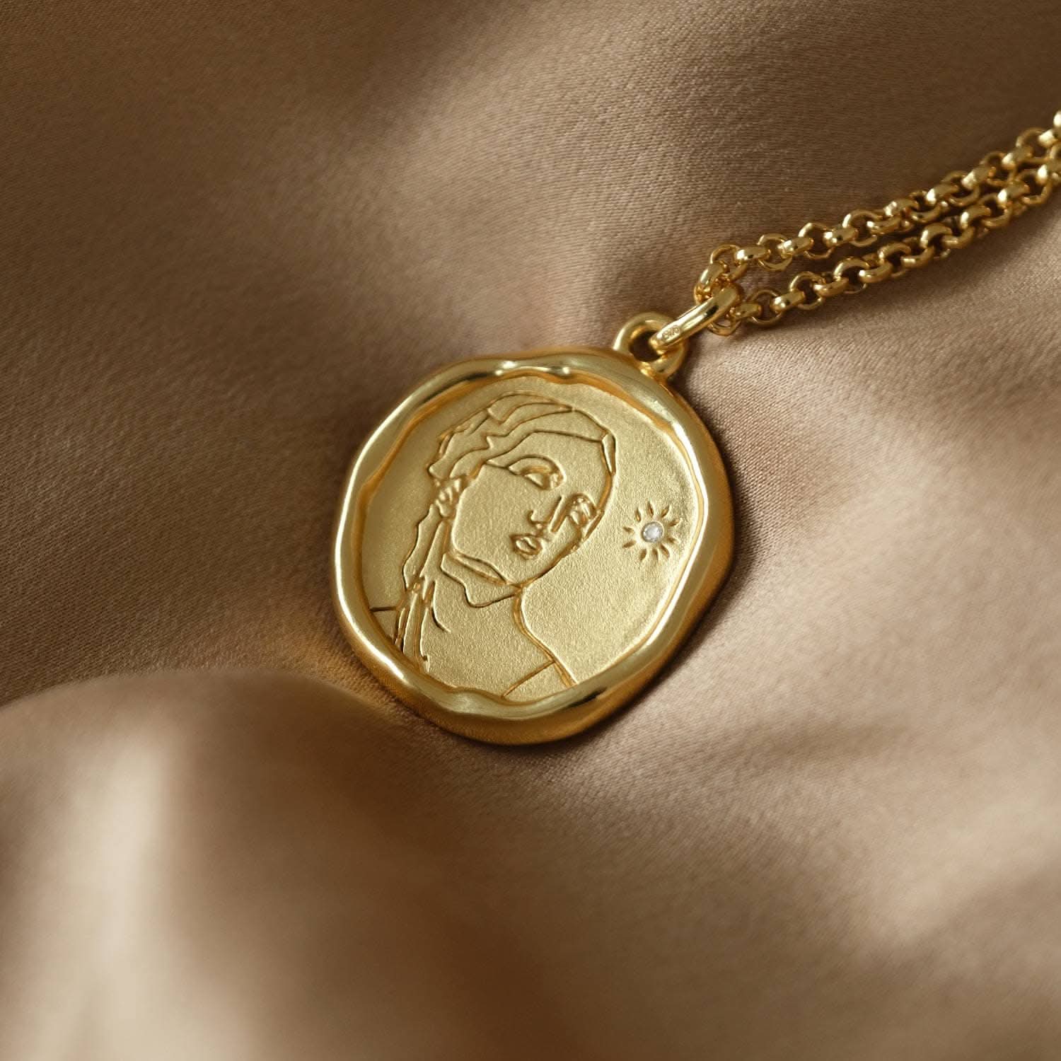 This medallion is etched with a line drawing of Circe, with a 1.3mm diamond sun shining down upon her, just like on her island, Aeaea.
